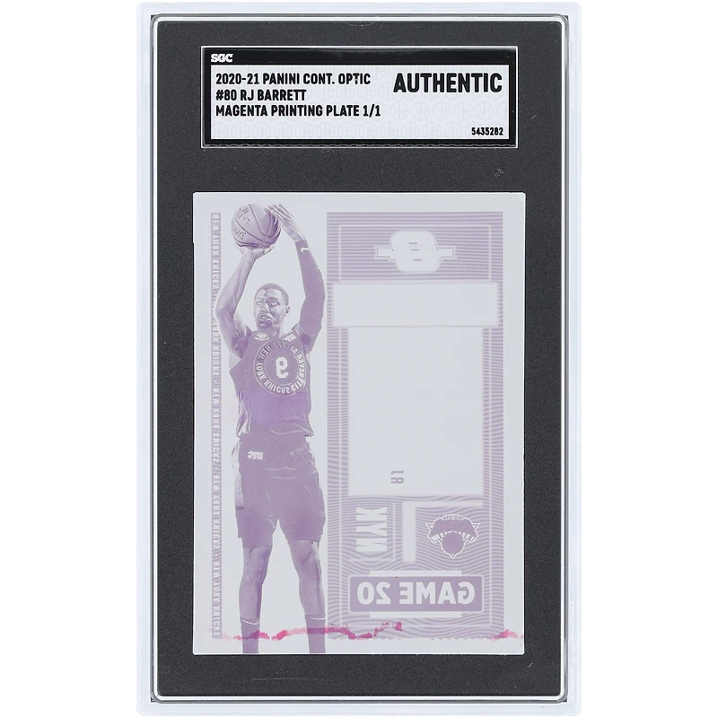This RJ Barrett 2020-21 Panini Contenders Optic Magenta Printing Plate #80 #1/1 SGC Authenticated Auth Card is ready to help you display your New York Knicks fandom. Encapsulated in a tamper-proof acrylic case for preservation, this striking card also showcases the New York Knicks star across the front to make it the ultimate collector's item.