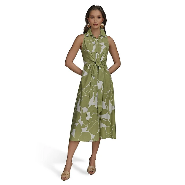 Robe chemise sans manches en lin et viscose nouée sur le devant