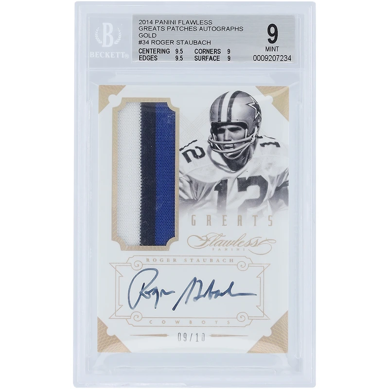 Roger Staubach Dallas Cowboys Autographed 2014 Panini Flawless Holo Gold Greats Tri-Color Relic #34 #9/10 BGS Authenticated 9/10 Card - 9.5,9,9.5,9 Subgrades