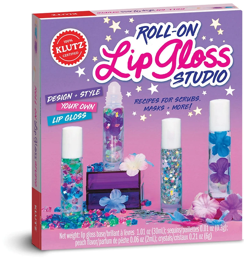 Start with personality quizzes to help you choose the perfect combo of gems, glitter, and flowers. Our unique formula of shiny gloss includes soothing aloe and sweet peachy flavor. Add polish to your lips with themes like unicorns, crystals, and galaxy. Then try DIY lip care recipes featuring easy-to-find ingredients like honey and sugar. Once you're finished designing your 4 lip glosses, decorate with stickers and assemble the cute display case to show them off! Comes with: 4 glass bottles, 4 roll-on applicators, glass container of sweet peachy flavor, faux flowers in 3 colours, faux crystals in 3 colours, iridescent star glitter, stickers, display stand