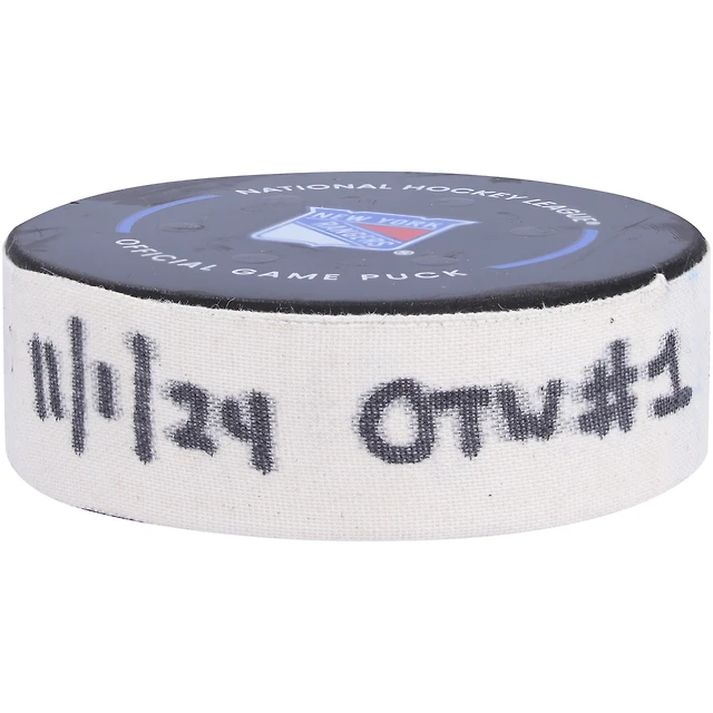 Rondelle de but utilisée par Adam Gaudette pour le match des Sénateurs d'Ottawa contre les Rangers de New York le 1er novembre 2024