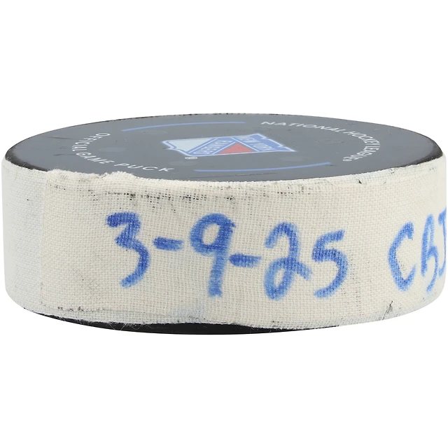 Rondelle de but utilisée par Dante Fabbro pour les Blue Jackets de Columbus contre les Rangers de New York, le 9 mars 2025