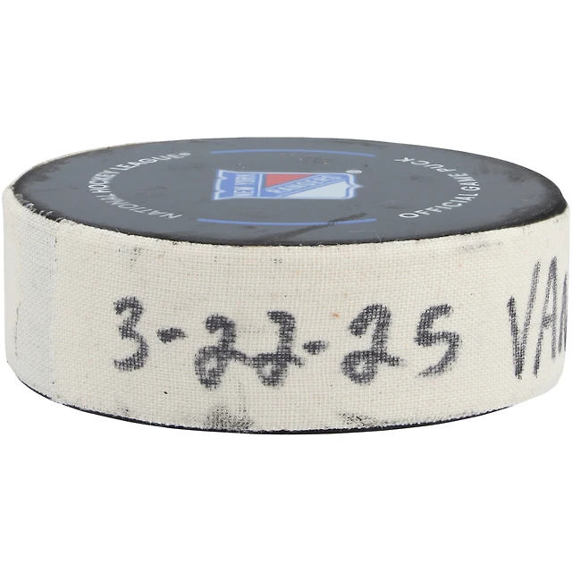 Rondelle de but utilisée par Drew O'Connor lors du match des Canucks de Vancouver contre les Rangers de New York, le 22 mars 2025