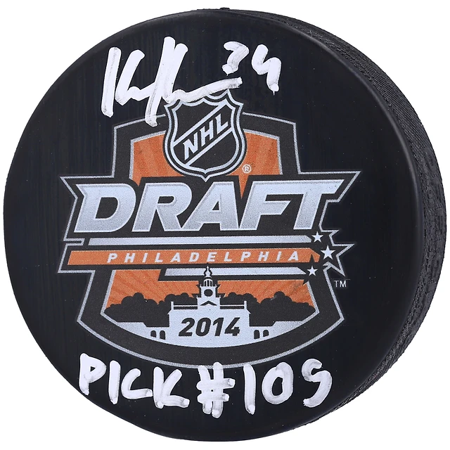 Rondelle de hockey autographiée par Kaapo Kahkonen des Sharks de San Jose avec logo du repêchage de la LNH 2014 et inscription « Pick #109 »