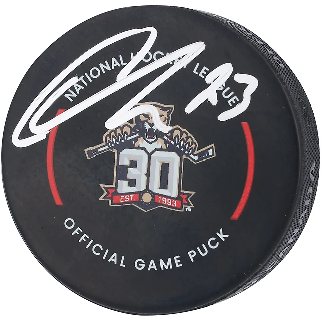 Rondelle de match officielle autographiée par Carter Verhaeghe pour le 30e anniversaire des Panthers de la Floride 2023-24