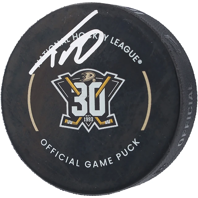 Rondelle de match officielle autographiée par Trevor Zegras pour le 30e anniversaire des Ducks d'Anaheim