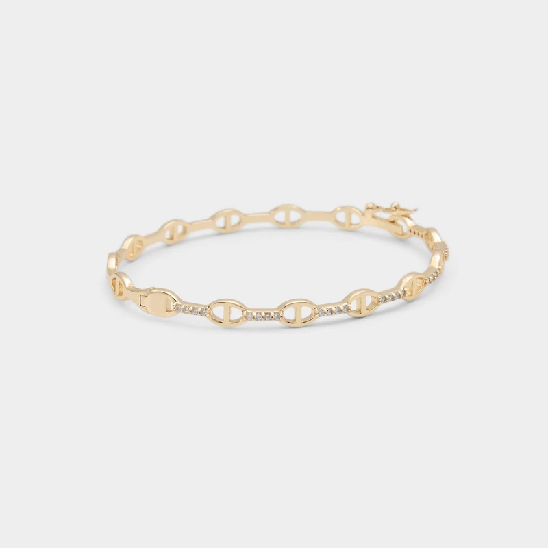 Cut-out oval links glimmer along a sleek gold band, catching light and giving movement its own quiet sparkle that feels understated yet confident for every moment you step out. Layer it under a sharp blazer for work polish, or stack with other gold pieces to elevate weekend dresses.