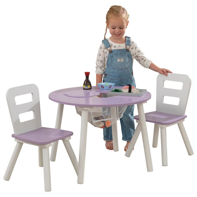 Whether coloring, crafting, doing homework or enjoying a snack, kids will love the KidKraft Round Storage Table and Chair Set. The two chairs are perfectly kid-sized and built from sturdy wood and metal. When playtime is done, kids can simply lift the table's center panel, push their craft items and toys into the mesh storage compartment and the table is clean. Little ones love to have a spot of their own, and parents love the understated simplicity of this design that looks good in any room.