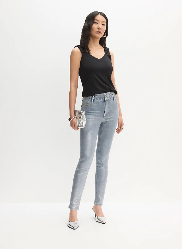 Ruched Strap Top & Metallic Slim-Leg Jeans