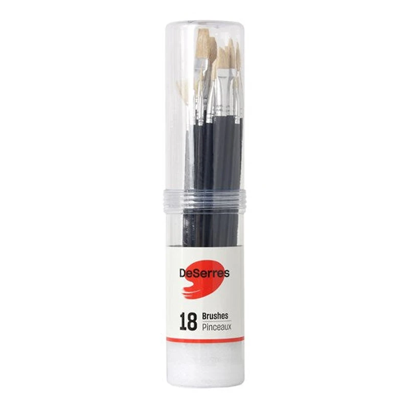 The assortment of DeSerres paintbrushes includes 18 paintbrushes with hog bristles, suited for acrylic and oil colours.The assortment of DeSerres paintbrushes includes 18 paintbrushes of different shapes and sizes to meet the needs of artists and allows for a wide range of techniques. Round, flat, fan, angular, pointed filbert.The assortment of DeSerres paintbrushes is an excellent value.Oil: dip the paintbrush in a solvent such as taltine. Clean in soapy water and rinse in warm water.Acrylic: clean in soapy water and rinse in warm water.Practical information:Never let dry before cleaning. Using a hydrating paintbrush cleaner after using taltine or soap prevents bristles from drying and keeps the supple shape of the paintbrush. Acrylic: clean in soapy water and rinse with warm water.