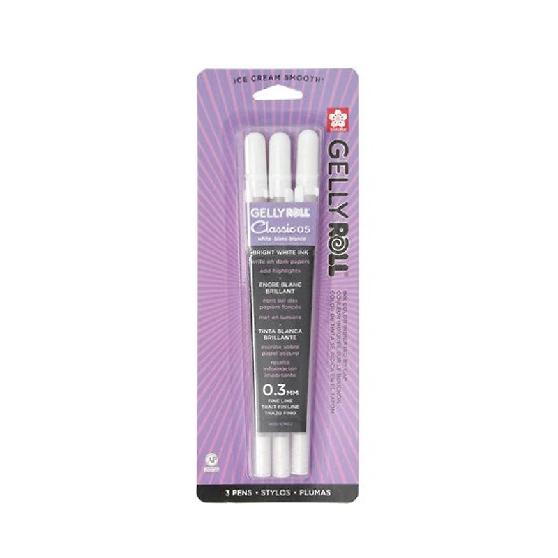 Gelly Roll® gel ink pens glide smoother than ballpoint pens, and don’t bleed or blot through thin paper. Boasting permanent, waterproof and fade-proof ink, these pens offer extremely comfortable writing, as well as consistent ink flow to the very last drop. Enhance any art project with a fun array of creamy colours!Includes 3 white Gelly Roll® pens (0.3 mm)