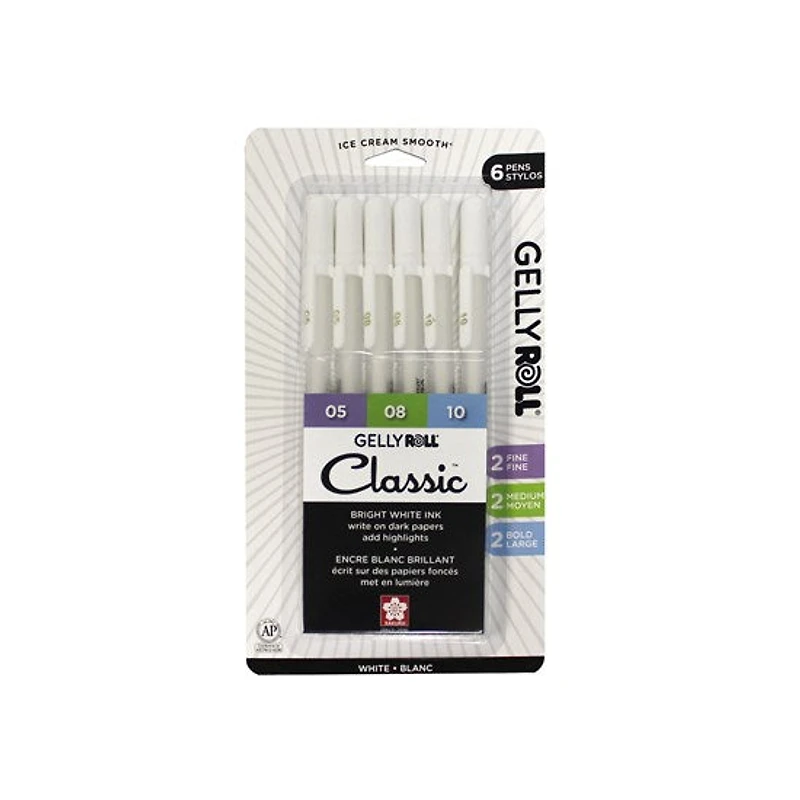 Gelly Roll® Pens glide better than traditional pens and don't bleed through thin paper. With permanent, waterproof and fade-proof ink, they offer smooth, comfortable writing and optimized ink flow. The opaque white ink is ideal for dark and coloured papers. Contains 6 Gelly Roll® pens in three different tips: two fine tips 05, two medium tips 08 and two broad tips 10.