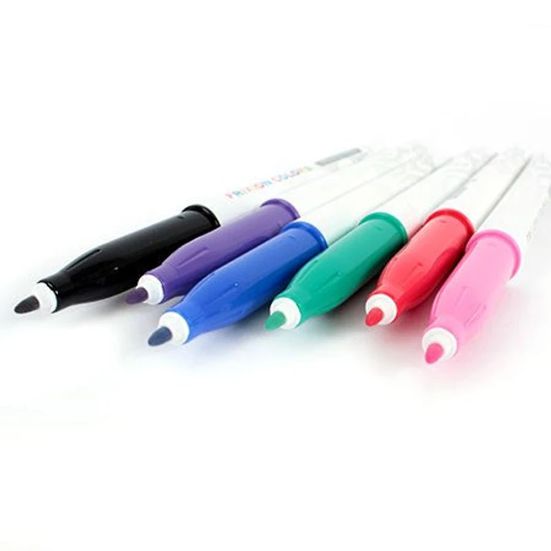 Draw, Delete and Repeat! Erasable colour markers with a line width of 2.5 mm. Set of 6 assorted colours.Ink disappears with friction using the rubber tipNo residueInk dries quicklyNo wear or tear on paperIf pen is exposed to extreme temperatures (<-10C;>60C), the ink can disappear or reappear