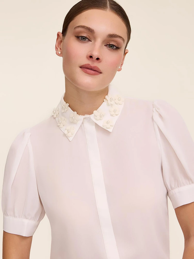 Step into refined, feminine style with this short sleeve blouse, designed with delicate floral appliqués along the collar that add a soft, romantic finish. The crisp silhouette and lightly structured sleeves create a polished look that works effortlessly for the office, while the subtle detailing makes it equally suited for brunches, dinner dates, and special occasions where you want something elevated yet wearable.