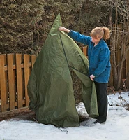This convenient tent-like cover protects shrubs and tall potted plants in cold weather.