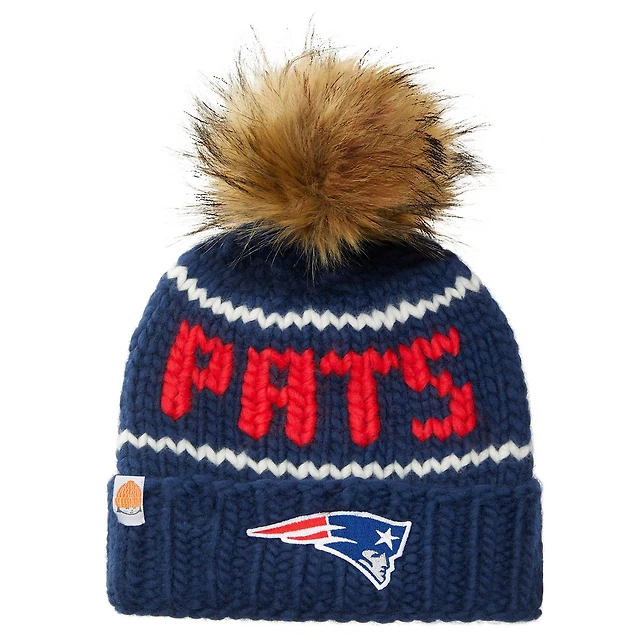 Sh*t That I Knit Navy New England Patriots Bonnet en laine mérinos à bords tricotés à la main avec pompon en fausse fourrure pour femme