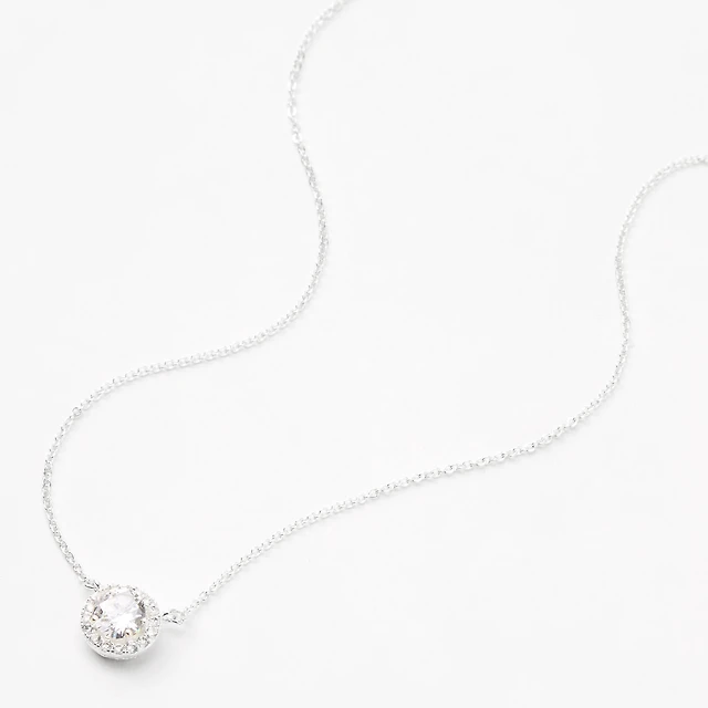 Silver-tone Cubic Zirconia Round Halo Pendant Necklace