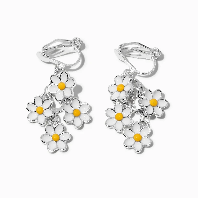 Silver-tone Linear Daisy 1" Clip-On Drop Earrings