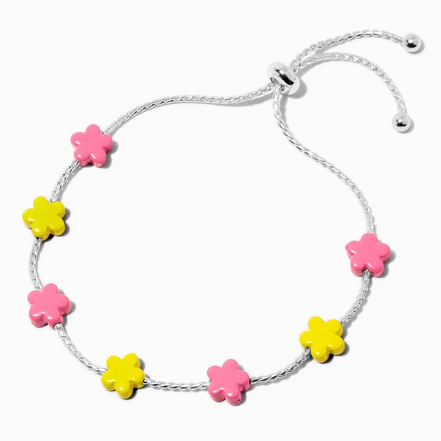 Silver-tone Pink & Yellow Flower Bolo Bracelet