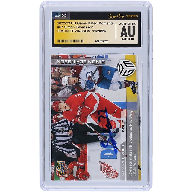 Simon Edvinsson Detroit Red Wings Autographié 2022-23 Upper Deck Game Dated Moments fait ses débuts dans la LNH alors que les Red Wings affrontent l'Avalanche #67 #/1199 Les fanatiques de CGC ont été témoins de la carte recrue authentifiée Auto 10