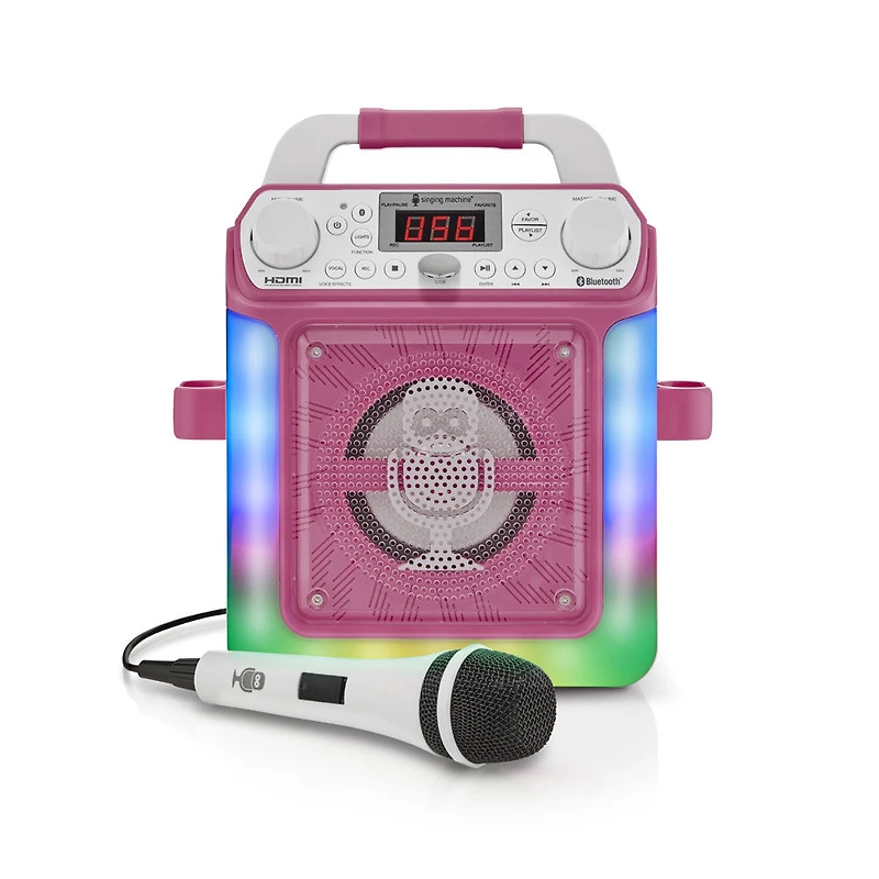 Works with all music and karaoke apps Six Voice-Changing Effects: Echo, Male, Female, Robot, Chipmunk and Radio Multi-colored LED lights synchronize to the music Built-In speaker for a dynamic sound system Two microphone inputs for duets (one microphone included) Did anyone say Karaoke Party? Connect the Groove Mini to your TV via HDMI cables and share your CDG's lyrics on the big screen. Create fun, lasting, singable moments with The Groove Mini! The Groove Mini combines your favorite Classic features with updated vocal-changing fun! Up your singing game with 6 fun voice-changing effects. Enjoy a light show that synchronizes to your voice. Connect your Bluetooth device and sing along to your favorite karaoke songs. Take this portable machine with you on your next road trip, tailgate, or pool party: simply add 6 "C" size batteries (batteries not included).