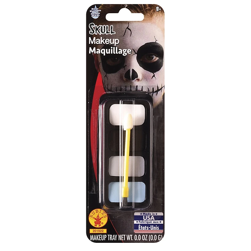 Let your imagination run wild and create fantastic patterns and designs on our face. The Skull Makeup Kit Includes: 4 color makeup palette, Sponge/Brush. Water Washable