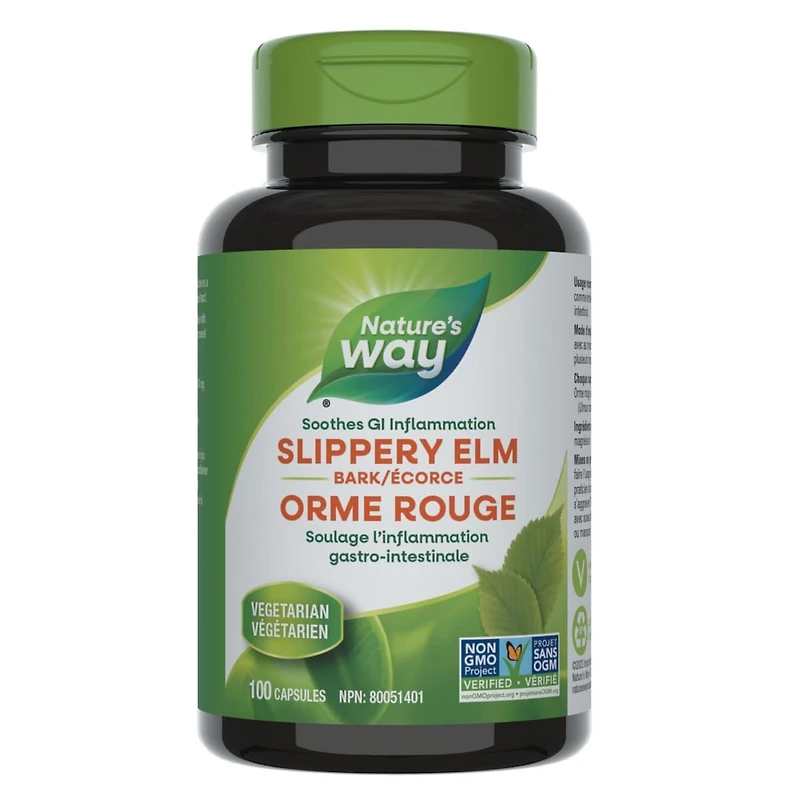 - Nature's Way Slippery Elm Bark is traditionally used in herbal medicine as a demulcent to soothe inflammation of the gastrointestinal tract. Nature's Way Slippery Elm Bark is Vegetarian and Non-GMO Project Verified. Nature’s Way contributes one percent of our total annual sales to Canadian land conservation organizations through our partnership with 1% for the Planet.