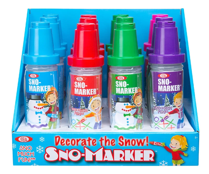 Ideal Sno Toys Sno Markers has everything you need to express your artistic creativity outdoors! Take coloring fun outdoors for everyone to see on a beautiful winter's day. Sno-Markers are used to color and decorate snow by mixing warm water with the Sno-Marker color packet (in a squeeze bottle). Shake, flip the cap, squeeze and spray. Sno-Markers come with a twist off cap so you can use them more than once and a flip-up nozzle to prevent annoying leaks and spills. Rinse out the Sno-Marker bottle with warm water when finished. Includes an 8in. Sno-Marker bottle, Red, Blue, Green, Pink or Purple Sno-Marker color packs and instructions. Recommended for children 5 years of age and older.