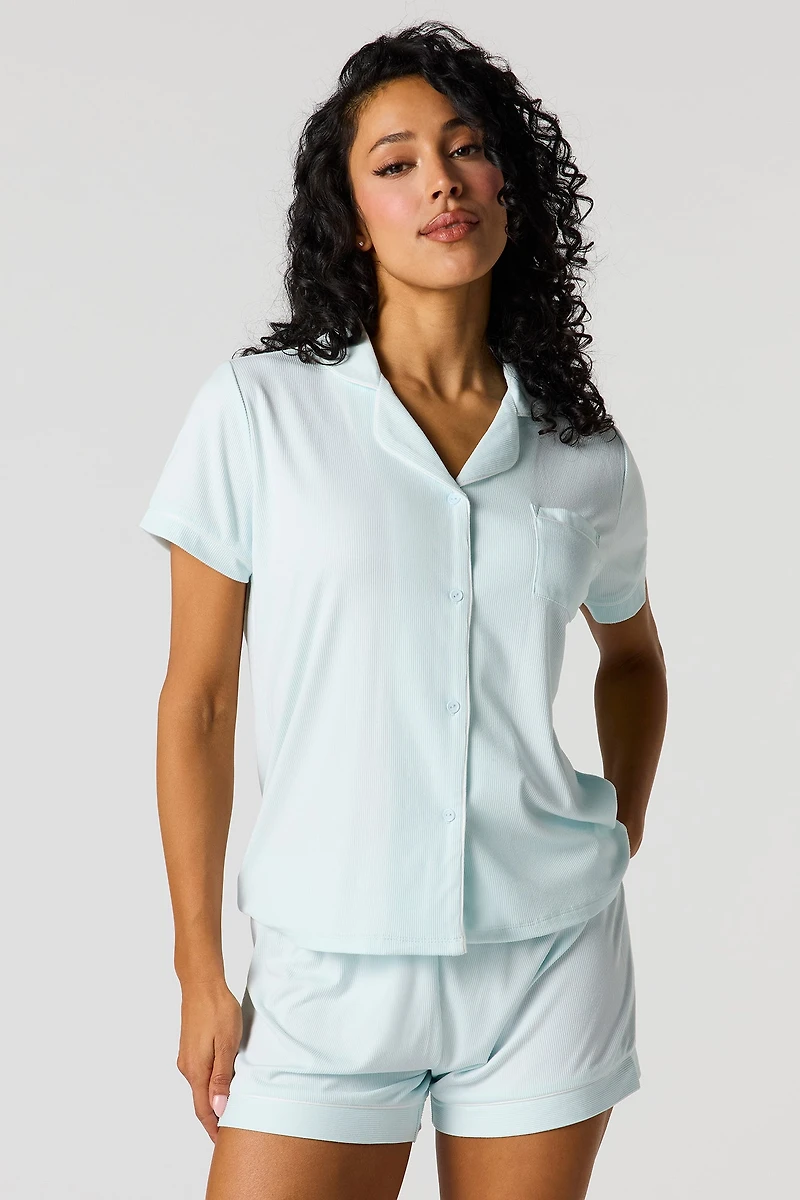 This 2-piece pajama set comes with a top featuring soft material, all-over print, contrast pipe trim, button-up front, collared neckline, chest pocket, short sleeves, and a matching short featuring soft material, all-over print, contrast pipe trim, and drawstring waist. Model: 5'9" in a size S 92% Polyester 8% Spandex Machine Wash in Cold Water - Gentle Cycle with Like Colours - No Bleach - Lay Flat to Dry - Low Iron on Reverse Side Imported