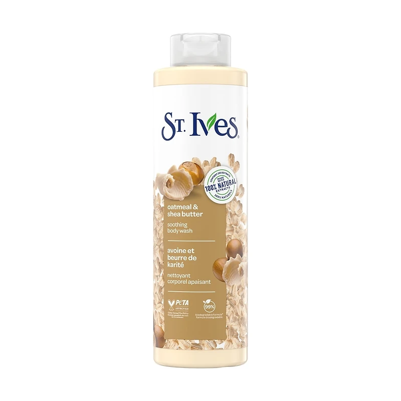 - Keep calm and soothe on with St. Ives Soothing Oatmeal & Shea Butter body wash. Like wrapping yourself in a comforting hug of natural oatmeal and shea butter Mother Nature's finest! Made with 100% natural oatmeal and shea butter extracts, this formula gives you a full-body cleanse that leaves your skin glowing This body wash brings a calming spa-like experience to your skin. Embrace the soothing vibes to pamper your mind and body Say hello to our 99% biodegradable formula, inspired and powered by Mother Nature This paraben-free and dermatologist-tested formula is designed to soothe your body St. Ives is PETA approved globally and cruelty-free. Made with no animal derived ingredients!