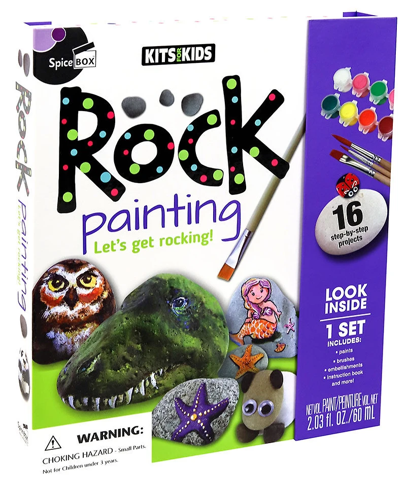 TONS OF FUN SUPPLIES: With plenty of paints, brushes and embellishments, you can make your favorite projects from the instruction book. USE YOUR IMAGINATION: Practice making the projects in the book, then use the techniques you've learned to turn your own inspiration into amazing creations! PREMIUM PACKAGING: This large-format kit comes packed with tools and materials in a sturdy box with magnetic closure, perfect for storing and organizing your supplies. STEP-BY-STEP INSTRUCTIONS: Easy-to-follow lessons show you how to turn ordinary rocks into extraordinary art! COMPLETE KIT INCLUDES: 1 64-page project book, 12 paint pots, 3 paintbrushes, 1 felt marker, 20 googly eyes, 30 assorted craft gems, 11 assorted pom-poms, 3 pipe cleaners, 3 magnets, 4 square sheets of EVA foam, 1 sponge AGE RANGE: Recommended for children 8 years old and up SpiceBox Kits for Kids Rock Painting Let's get rocking! Take a closer look at the plain, ordinary rocks under your feet and turn them into amazing works of art! Use the paints, tools and craft supplies in the kit to transform your pebbles into farmyard animals, sea creatures and more!