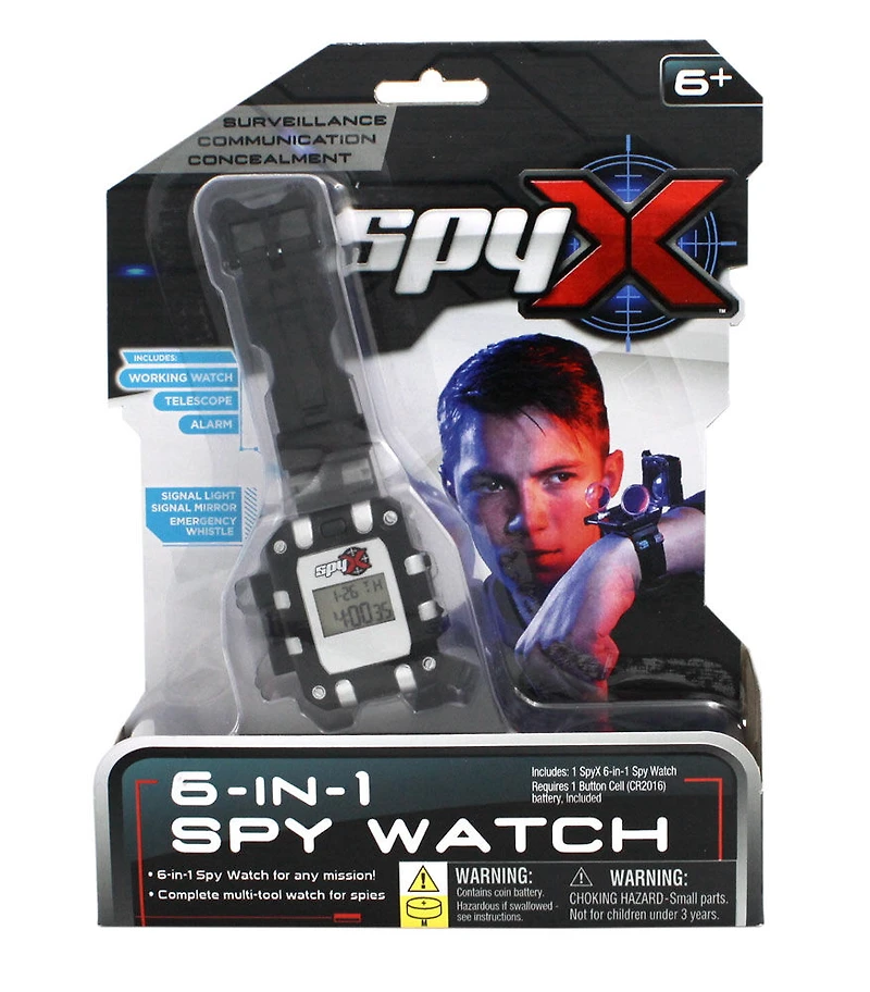 Telescope with Fold-Out Lenses Message Capsules Singal Mirror with Secrect Compartment Signal Whistle Gear-up and become a world-class secret agent with the 6-in1 SpyX Watch, the perfect Multi-tool for every stealth Mission! 6-in-1 Spy Watch hides tons of secret tools: Telescope with short and long range Fold-Away Lenses, Secret Message Capsules, Signal Mirror with Hidden Compartment, and Signal Whistle, all build around a real working watch! Other watch features include: time, alarm, and stop watch. SpyX gadgets help you navigate through stealth operations: Surveillance, Communication, Security, and Defense. Collect all the real-working SpyX devices to outsmart enemy spies and say, "Mission Accomplished!"