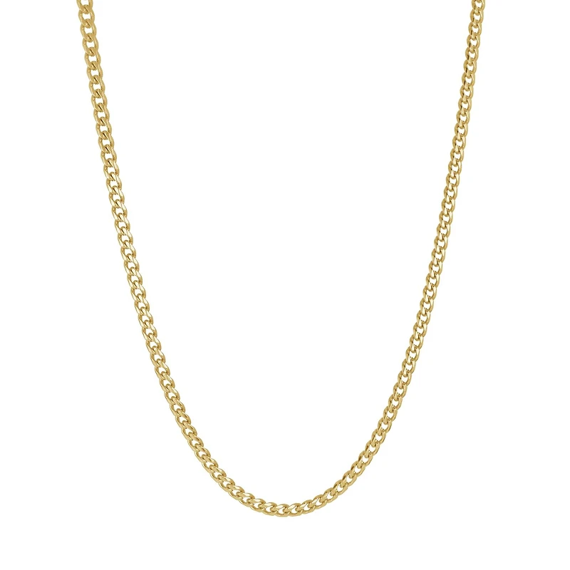 This sleek 22-inch curb chain features 3.3mm polished links, plated in rich gold for a bold yet refined look. Crafted from durable stainless steel, it combines strength and style, making it a versatile accessory that adds a touch of luxury to any outfit. Perfect for wearing alone or pairing with your favorite pendant.