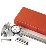 This American-made caliper has outstanding fit and finish. Manufactured from hardened stainless steel, it has finely detailed contact surfaces on the jaws and a smooth thumb wheel operation for fine adjustment. The 1 3/8" diameter dial, with 0.001" graduations, has clear black-on-white markings.