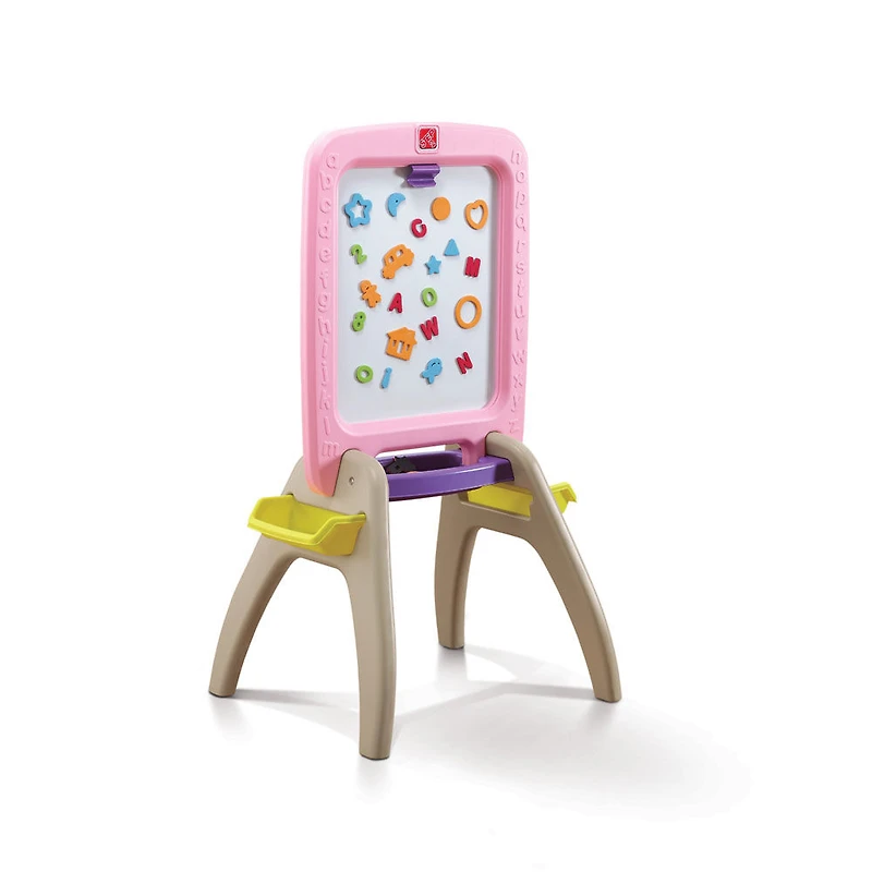 This Step2 All Around Easel for Two in pink is to make developing writing skills fun! Little artists can get creative on the chalkboard or the dry erase board. This artistic play set helps enhance fine motor skills as little ones draw, write and place magnets onto the board. It's compact and encourages multi-child play as kiddos play with both sides of the easel. Made in USA of US and some imported parts.