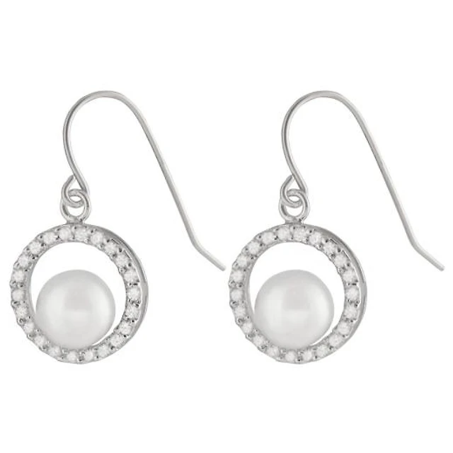 Sterling Silver 7-8mm White Button Pearl & Cubic Zirconia Earrings