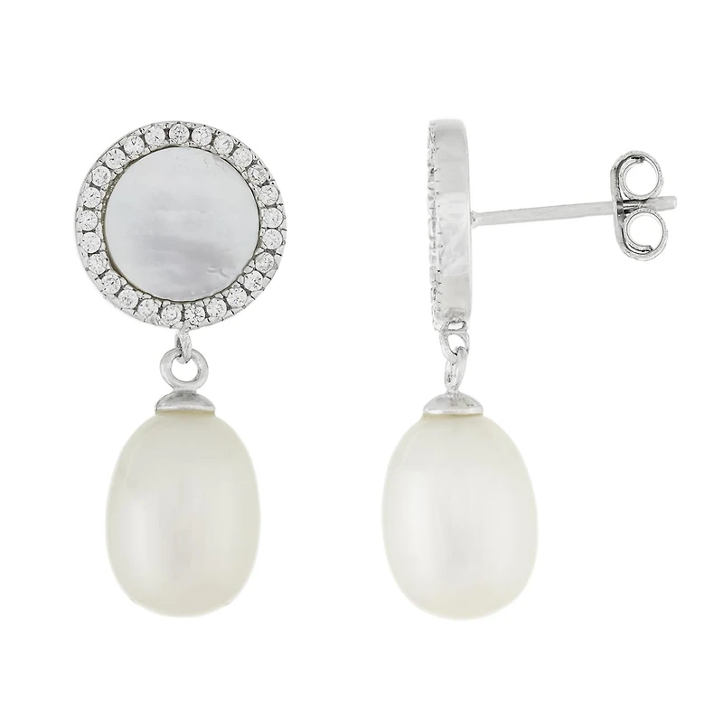 A pair of white Mother of Pearl dangling white freshwater pearl earrings in sterling silver rhodium plated