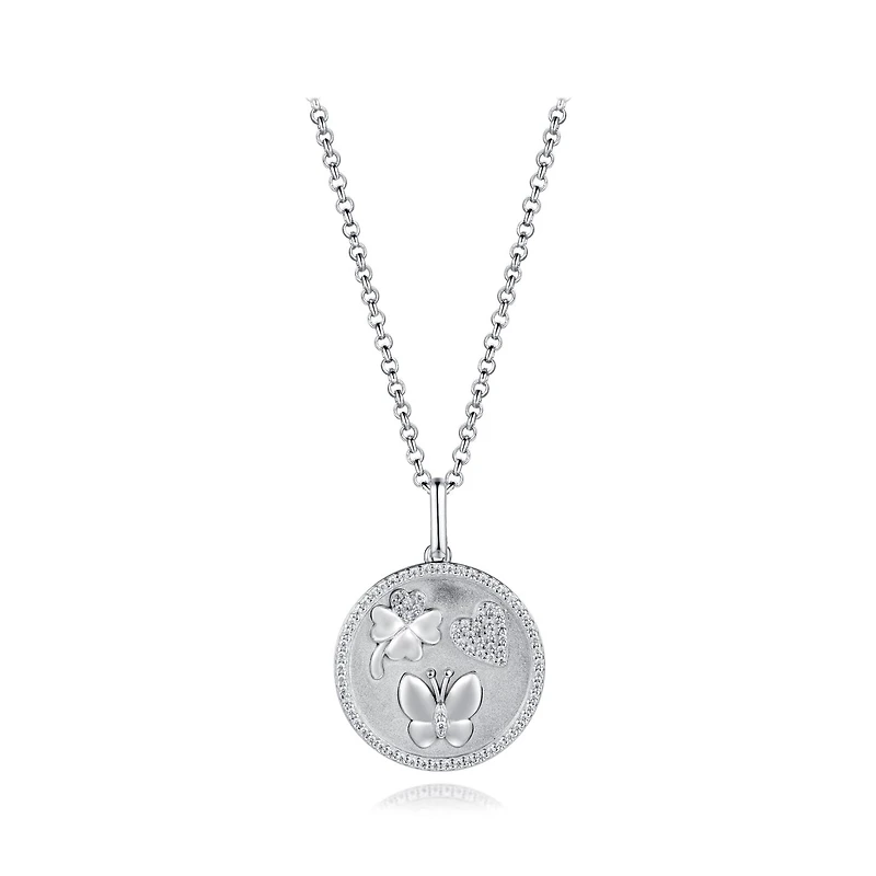 This Luck, Love, Happy cubic zirconia pendant is crafted in lustrous sterling silver and hangs on a beautiful 19 inch chain. This necklace is sure to make a standout addition to any jewellery collection. Choose this shimmering piece for yourself or as a special gift for someone you love.