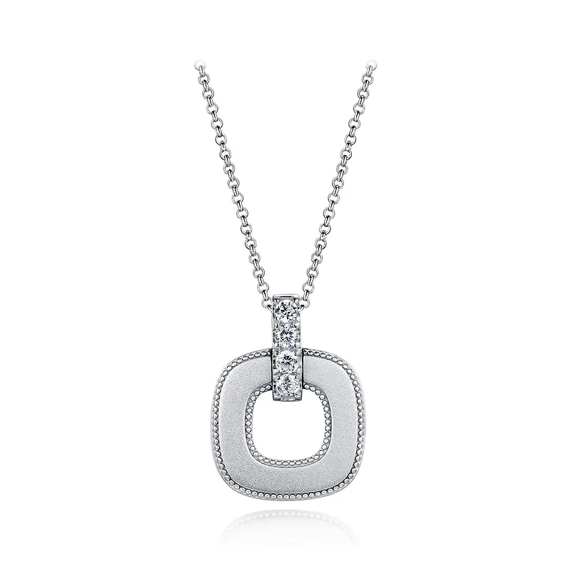 The pendant features a sparkling cubic zirconia at its center, surrounded by intricate milgrain detailing that adds texture and sophistication. Set in sterling silver, the pendant hangs gracefully from a 19-inch chain, making it the perfect length for layering or wearing alone for a refined look.