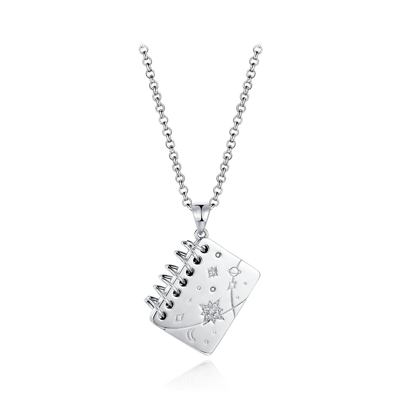 This planetary spiral notebook cubic zirconia pendant is crafted in lustrous sterling silver and hangs on a beautiful 19 inch chain. This necklace is sure to make a standout addition to any jewellery collection. Choose this shimmering piece for yourself or as a special gift for someone you love.