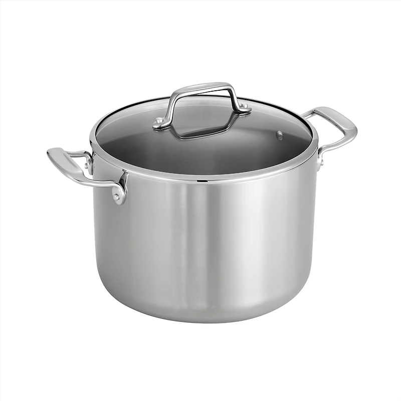 8 Qt tri-ply stainless steel stock pot with lid, perfect for soups and stews.