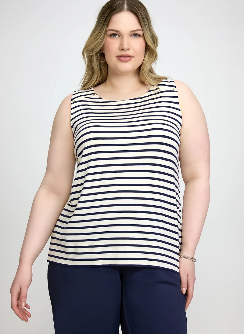Perfect for lightweight layering or warm-weather styling with a subtle textured stripe. Style with simple bottoms and minimal accessories for an effortlessly chic look.Stripes throughout Crew neck Hardware detailing at shouldersHighest shoulder point: 26"