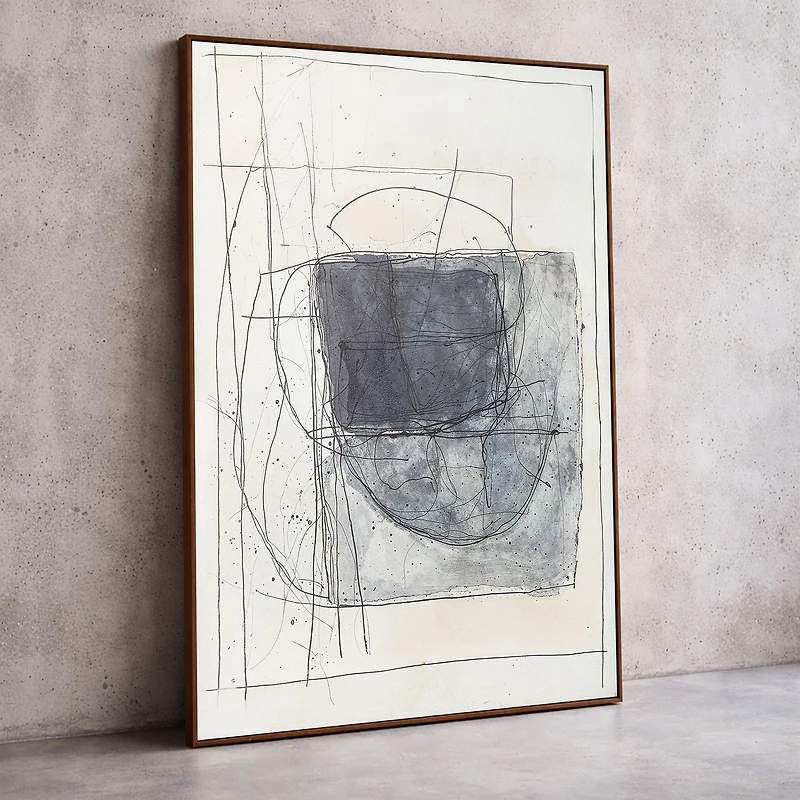 This hand-painted canvas evokes contemplative complexity through its layered geometric forms and spontaneous line work. Overlapping rectangles, circles, and delicate linear elements create an architectural meditation in soft grays and charcoal again
