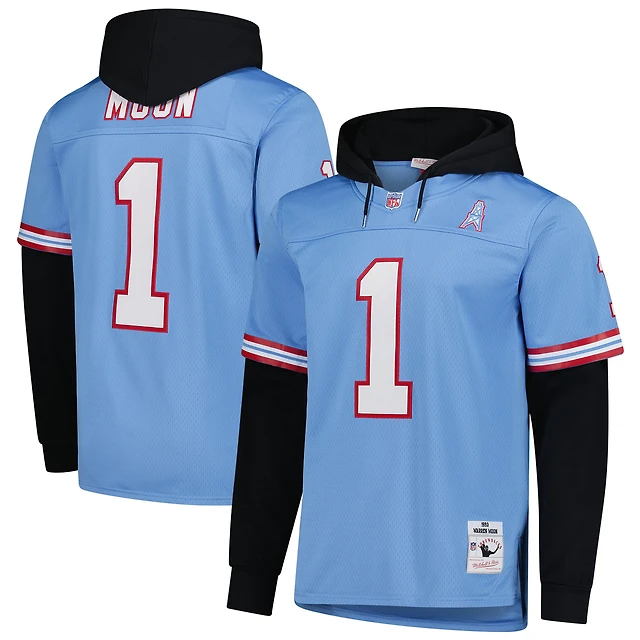 Sweat à capuche bleu clair pour homme Mitchell & Ness Warren Moon des Oilers de Houston avec nom et numéro joueur Legacy Jersey