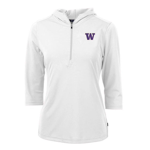 Sweat à capuche manches 3/4 et demi-zip pour femme, blanc, Cutter & Buck, Washington Huskies, Virtue Eco Pique