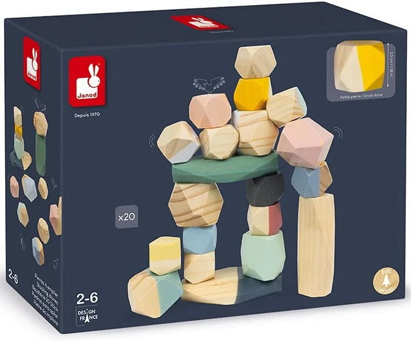 JEUX D'EMPILEMENT POUR LES PETITS : Des pierres à empiler au design original et qui permet de faire travailler la maniabilité, la motricité fine et le sens de l’équilibre, Les différentes formes permettront à l’enfant d’appréhender au mieux l’espace et d’ajouter une diversité dans ses constructions, Les pierres en bois sont très légères et pensées pour ne pas avoir de bord contondant, L’enfant pourra ainsi s’amuser à construire facilement et en toute sécurité, CRÉATIVITÉ ET IMAGINATION : Les possibilités sont infinies, impossible de s’ennuyer, Il faut simplement de l’imagination et de la créativité, L’enfant peut également s’amuser à empiler un maximum de bloc les uns sur les autres ou bien à faire vivre ses constructions pour s’évader dans des aventures incroyables, COLLECTION SWEET COCOON : Sweet Cocoon, c'est une gamme premier âge aux couleurs délicates et pastel, inspirée des tendances actuelles pour accompagner les premiers apprentissages tout en douceur CARACTÉRISTIQUES : 20 pierres en bois légères qui permettent la construction de structures inventées par l’enfant, Peintes à la peinture à l’eau, certaines pièces sont dans tes tons pastel et d'autres sont en couleur naturelle du bois, Des formes diverses et variées : hexagonales, cylindriques, cubiques, DESIGN FRANCE : Les jouets Janod sont imaginés en France, dans le Jura, avec une attention particulière portée sur les matériaux utilisés, le style et les couleurs; Des jouets et des jeux originaux, audacieux, éducatifs et réfléchis pour accompagner vos enfants dans leur épanouissement et leur développement cognitif, psychomoteur et socio-émotionnel