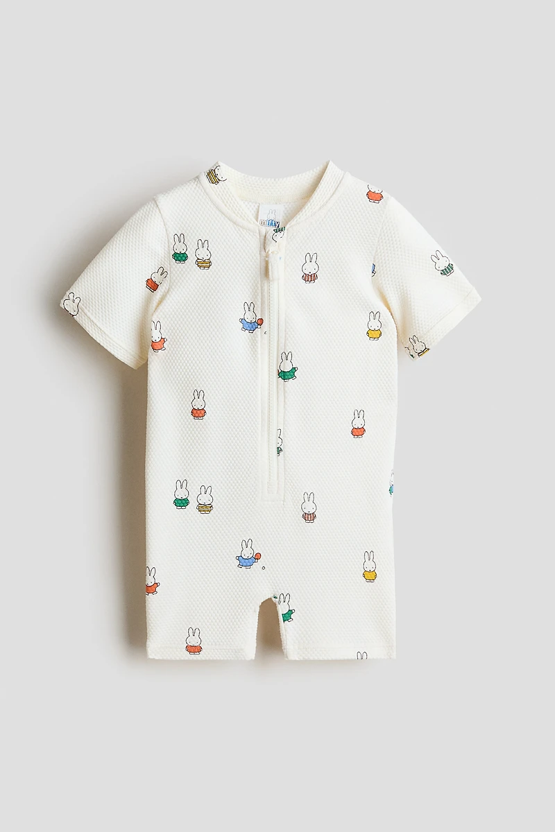 Printed, short-sleeved swimsuit in UV-protective fabric. Small stand-up collar, zipper at front with anti-chafe chin guard, and ruffle-trimmed shoulder seams. UPF 50.