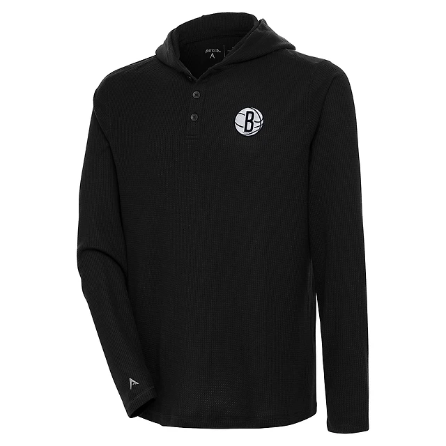 T-shirt à capuche Henley manches longues Antigua Black Brooklyn Nets Strong Hold pour homme