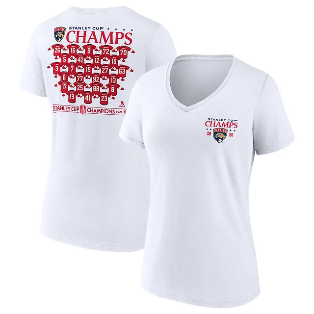 T-shirt à col en V blanc Fanatics pour femmes, maillot des Panthers de la Floride, champions Coupe Stanley 2025