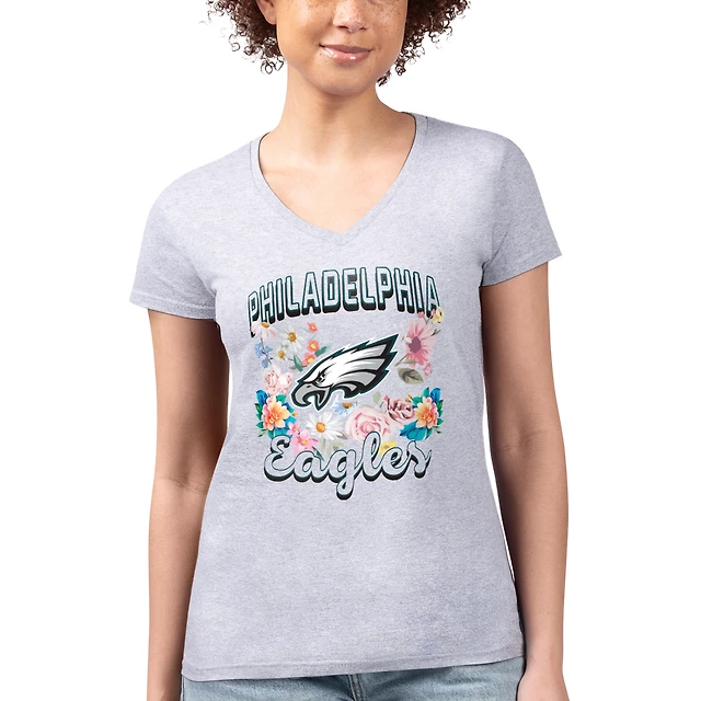 T-shirt à col en V ultra-mince et léger G-III 4Her par Carl Banks pour femme, gris chiné, motif floral, logo de l'équipe des Eagles Philadelphie
